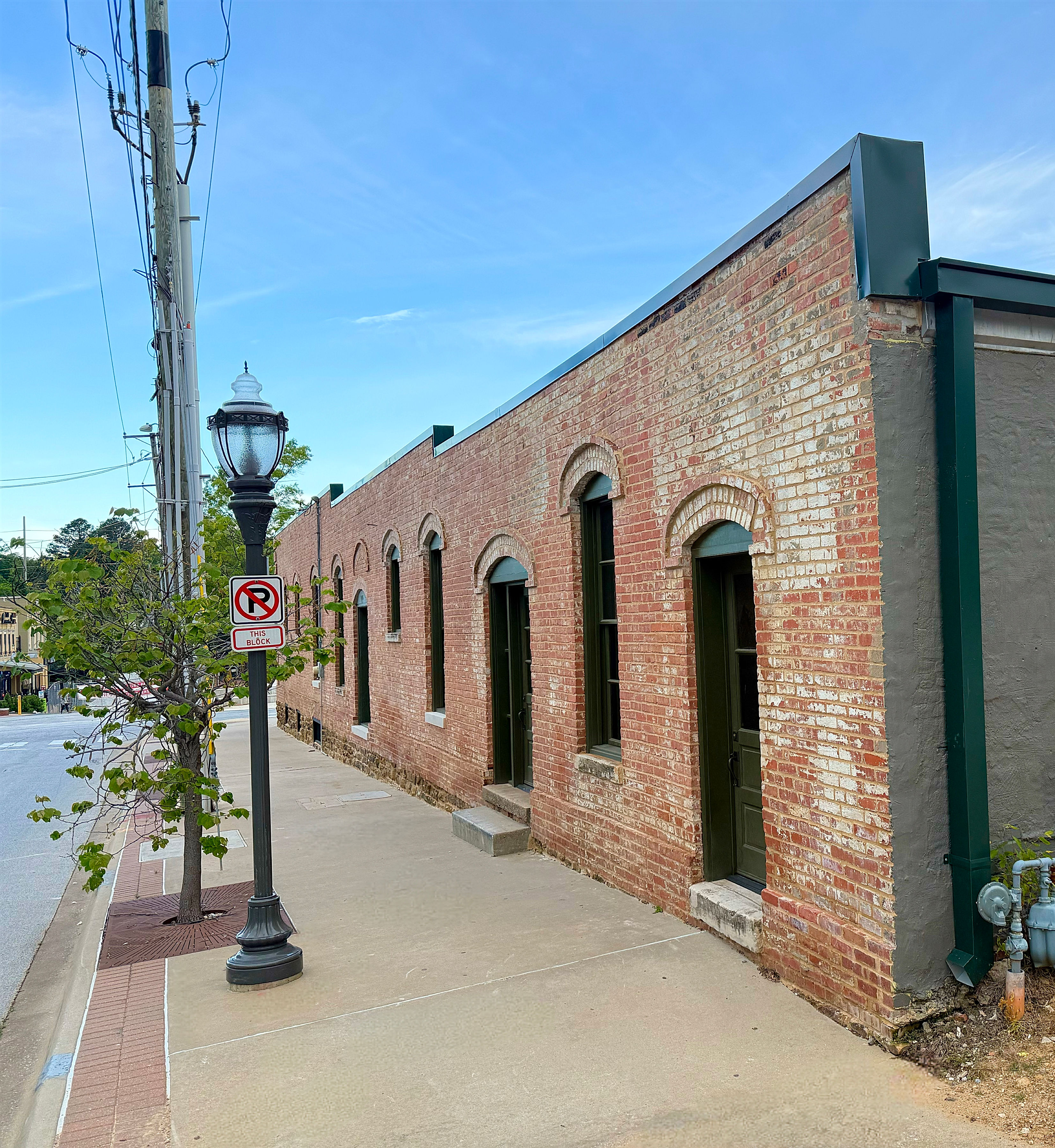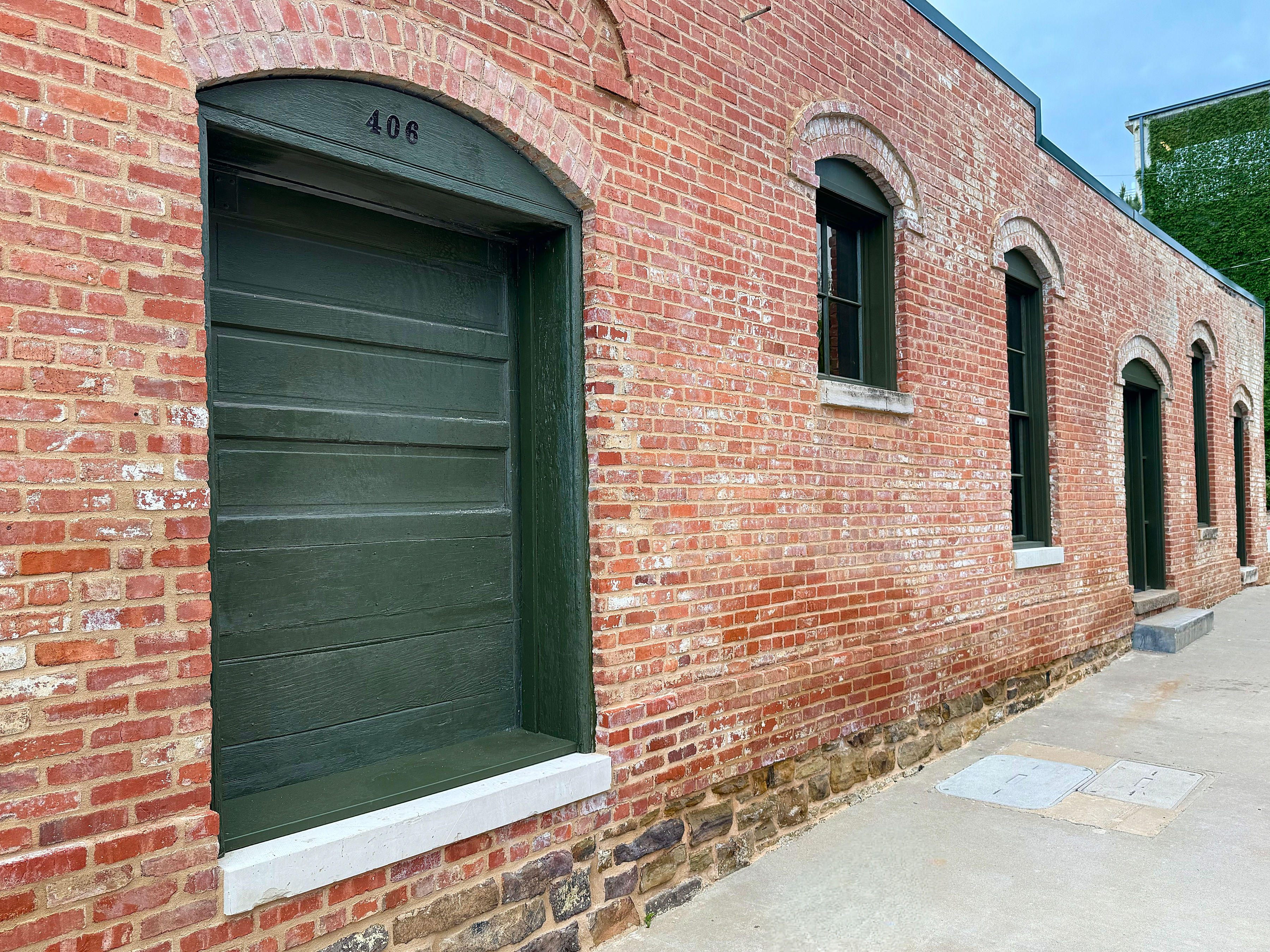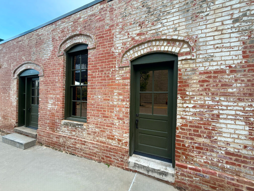 The stabilization process involved meticulously removing, cleaning, reconstructing, and repointing the exterior brick, installing new concrete and stone foundations at the west end of the building, re-supporting the existing roof structure, fabricating and installing new period-specific wood doors and windows to match the originals, and constructing a new exterior deck that replicates the historical elevated platform condition